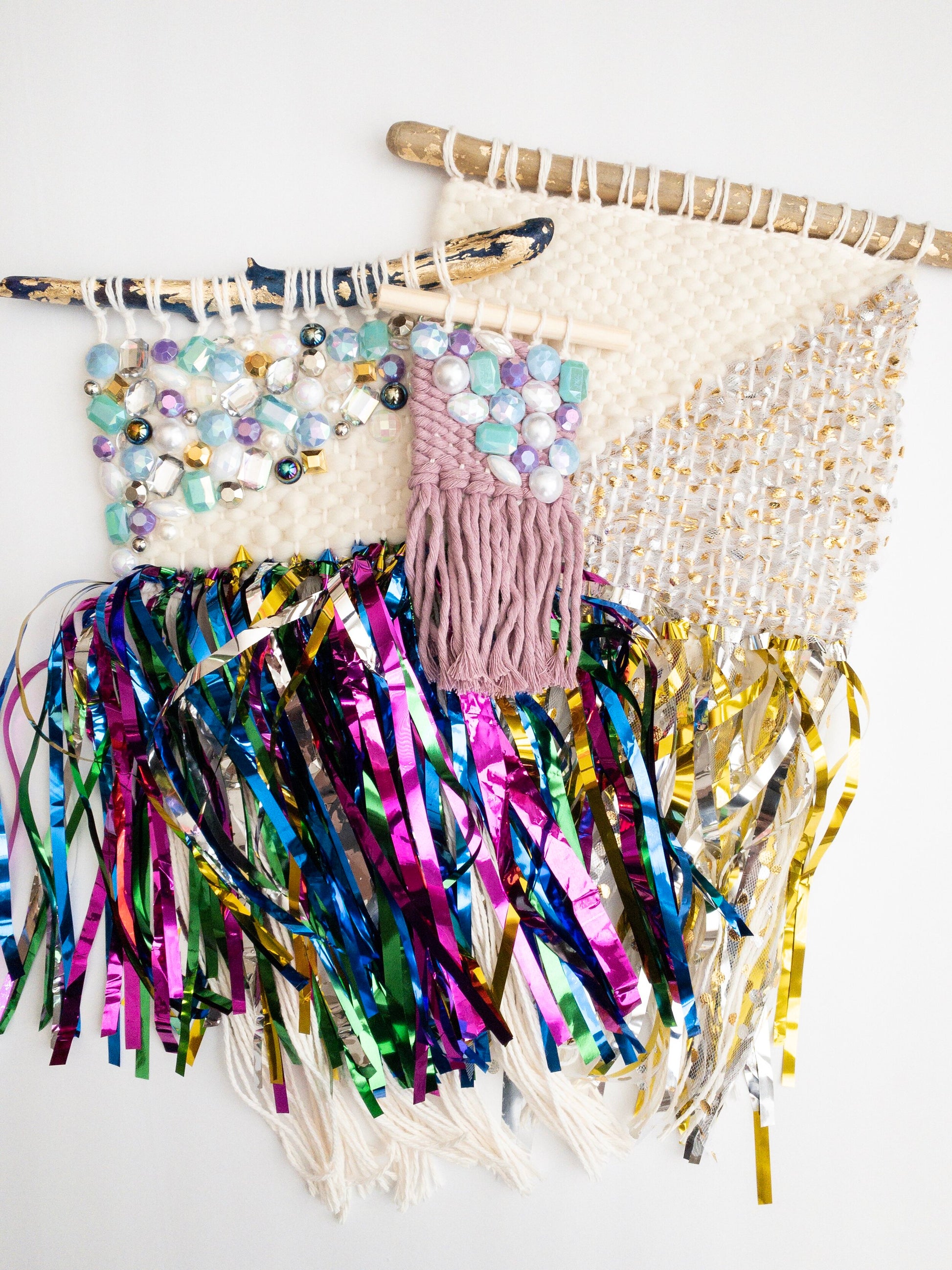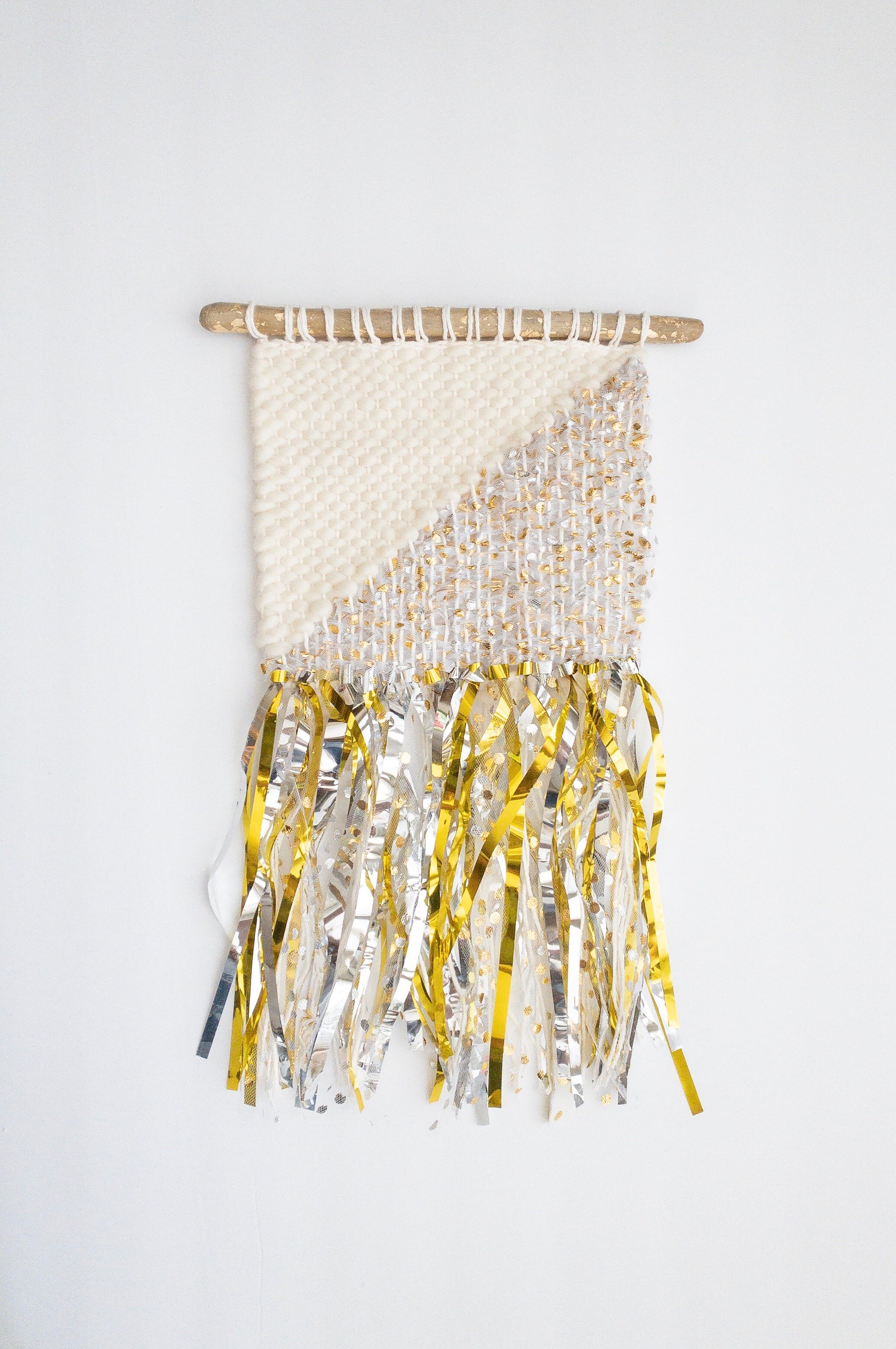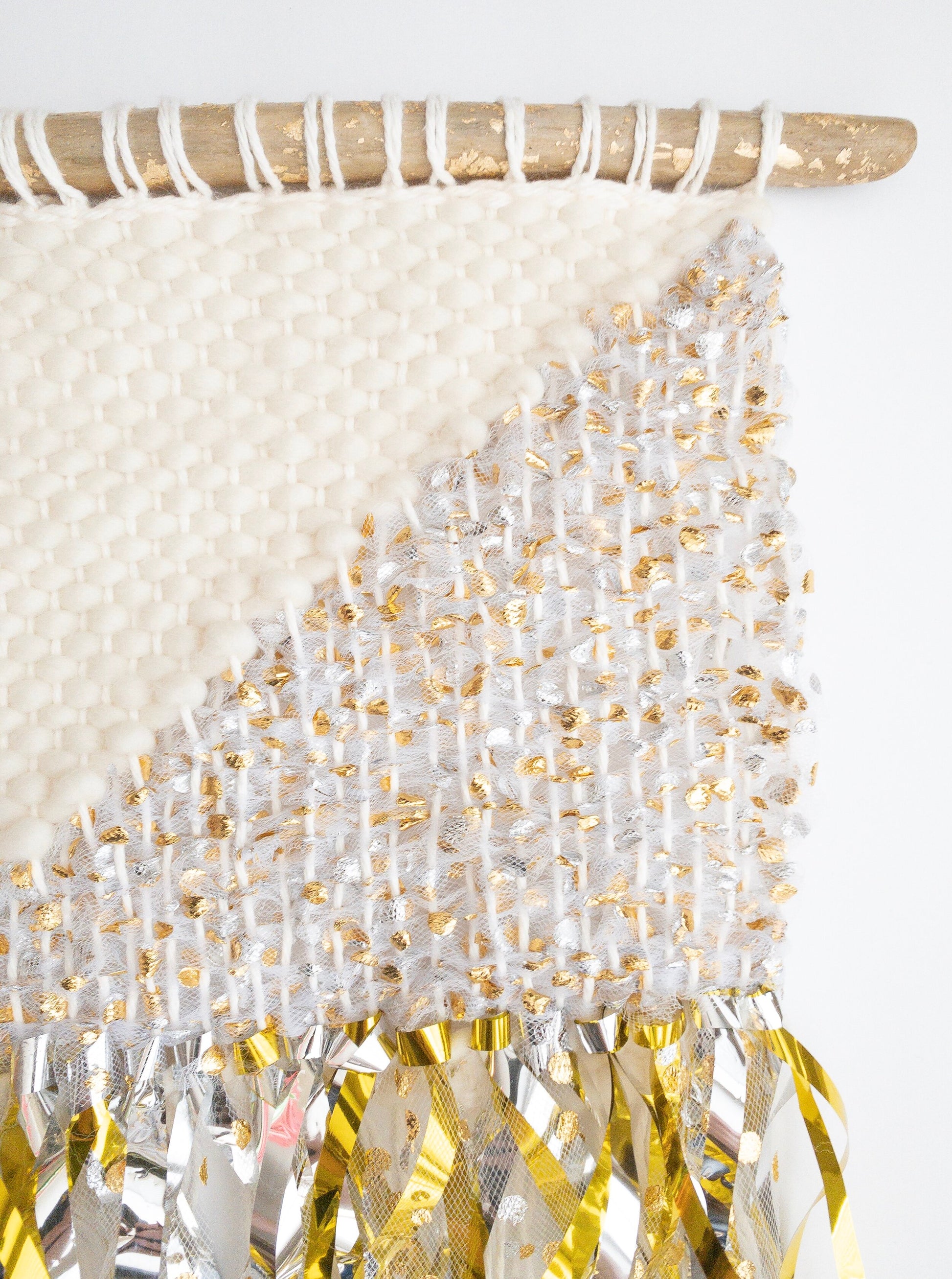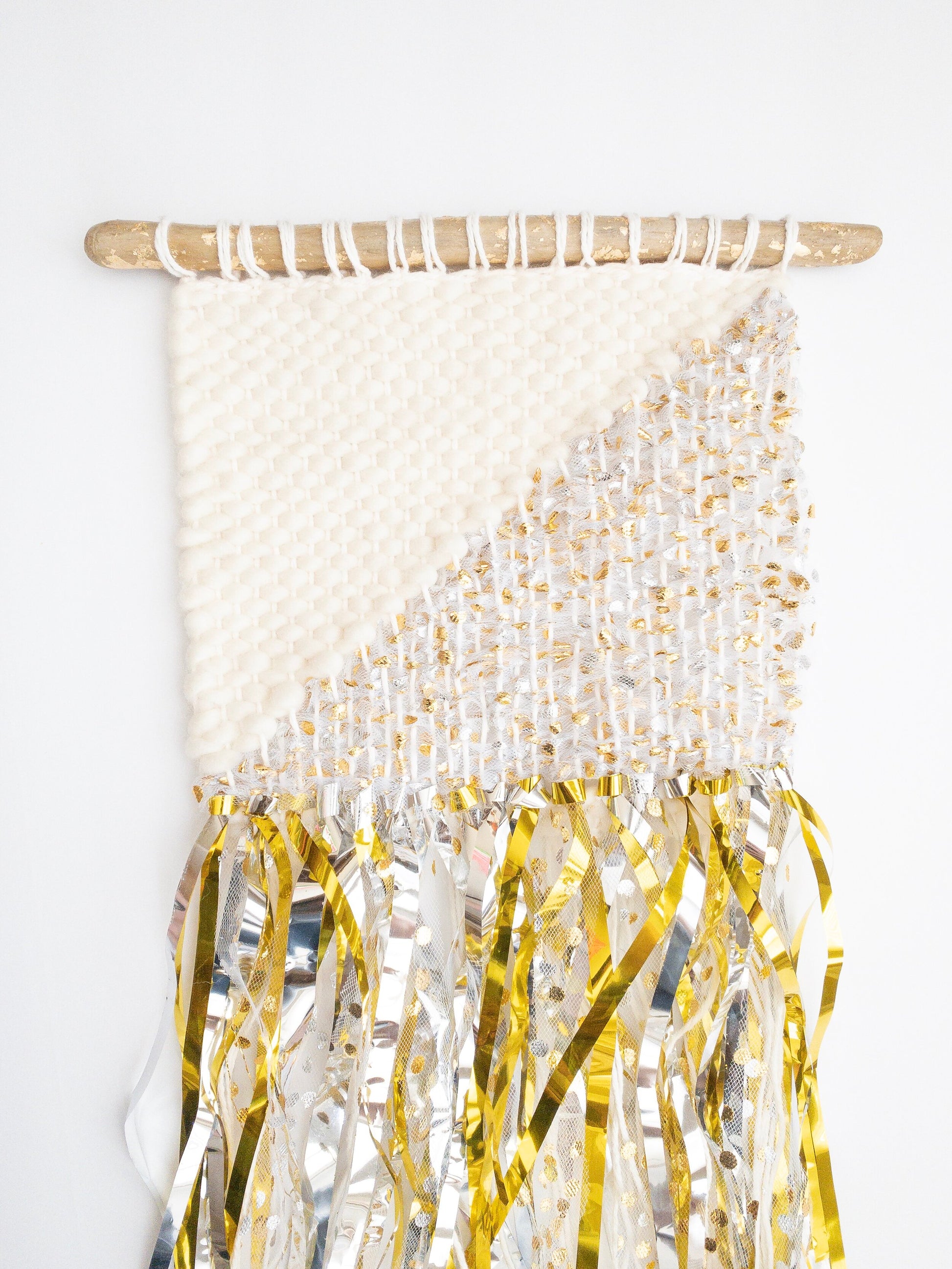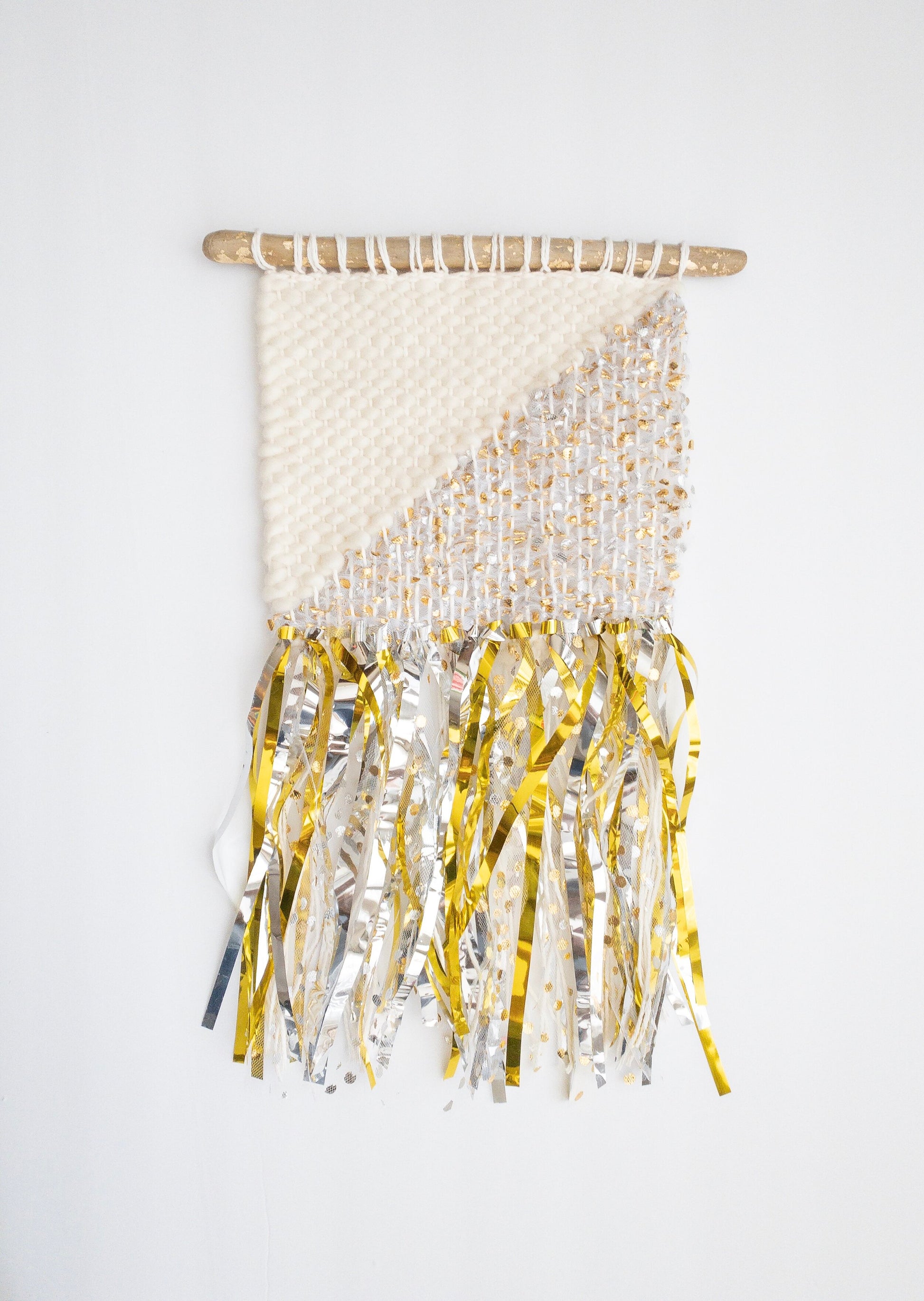This piece is a total PARTY! It is the glitz and glam and center of the party while still being subtle, like a disco ball. Made with ivory wool, foil tulle, gold and silver tinsel, and cotton string.