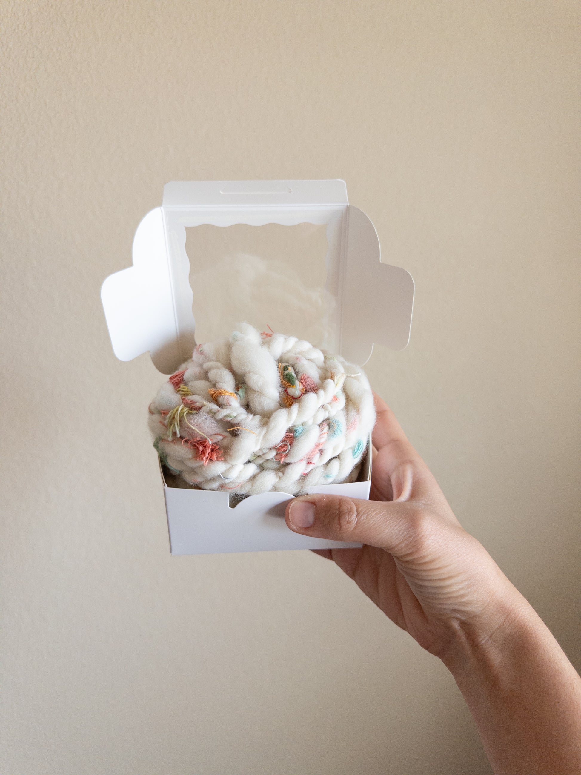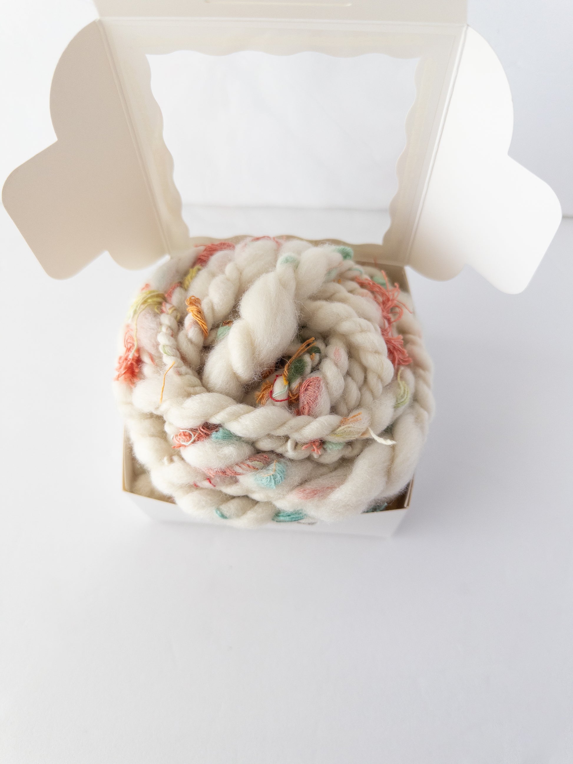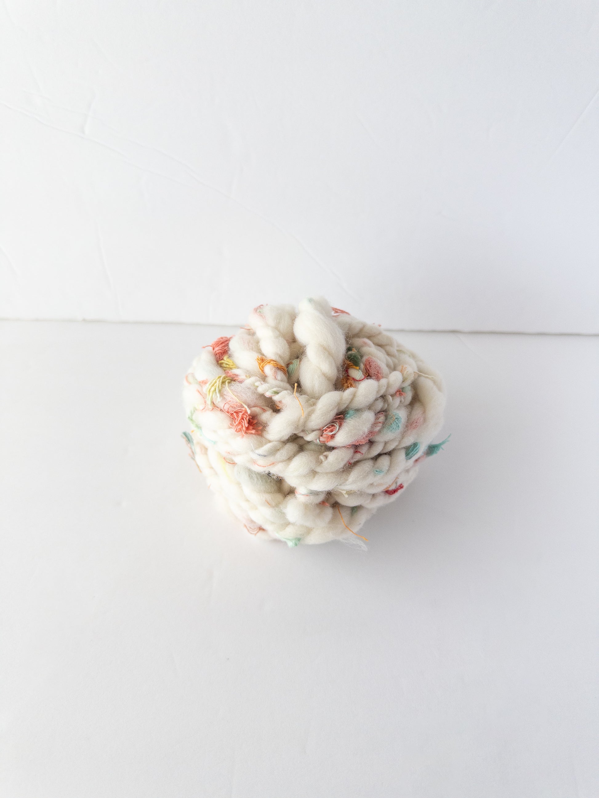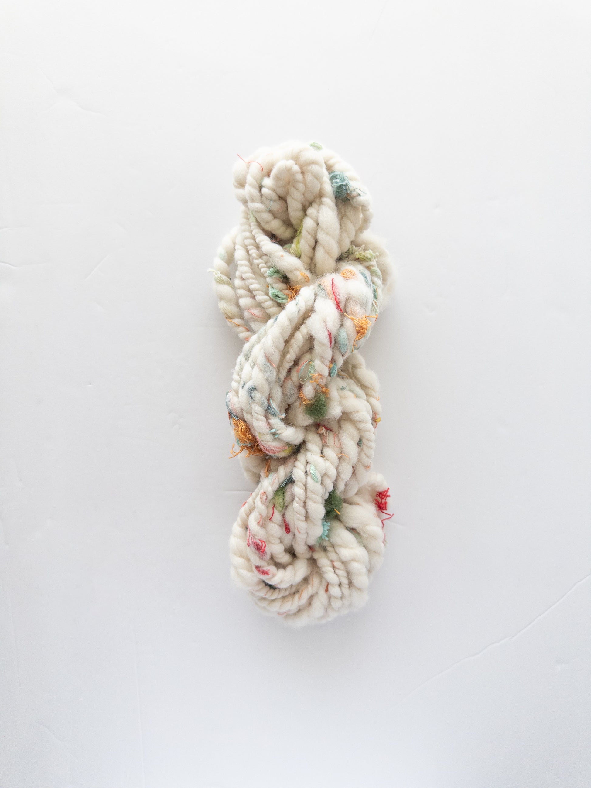 This is an art yarn that I spun myself, the twist may be too tight or too loose in some areas as well as thick and thin. Pretty much, it is not perfect but will create a gorgeous organic look in your weavings.