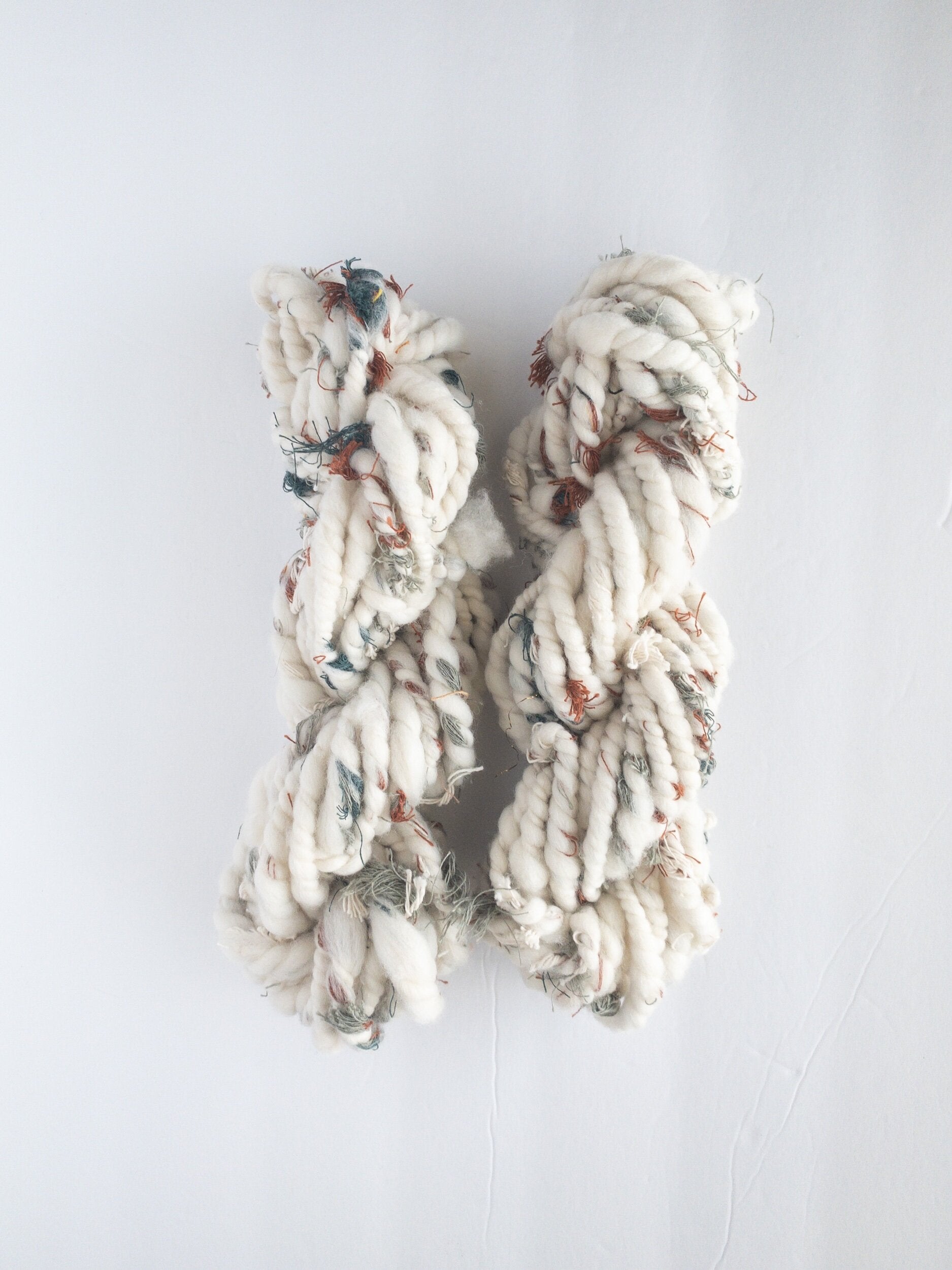 2 ply ivory wool base with rust, sage green, and evergreen/forest green scraps mixed in. Listing is only for one yarn.