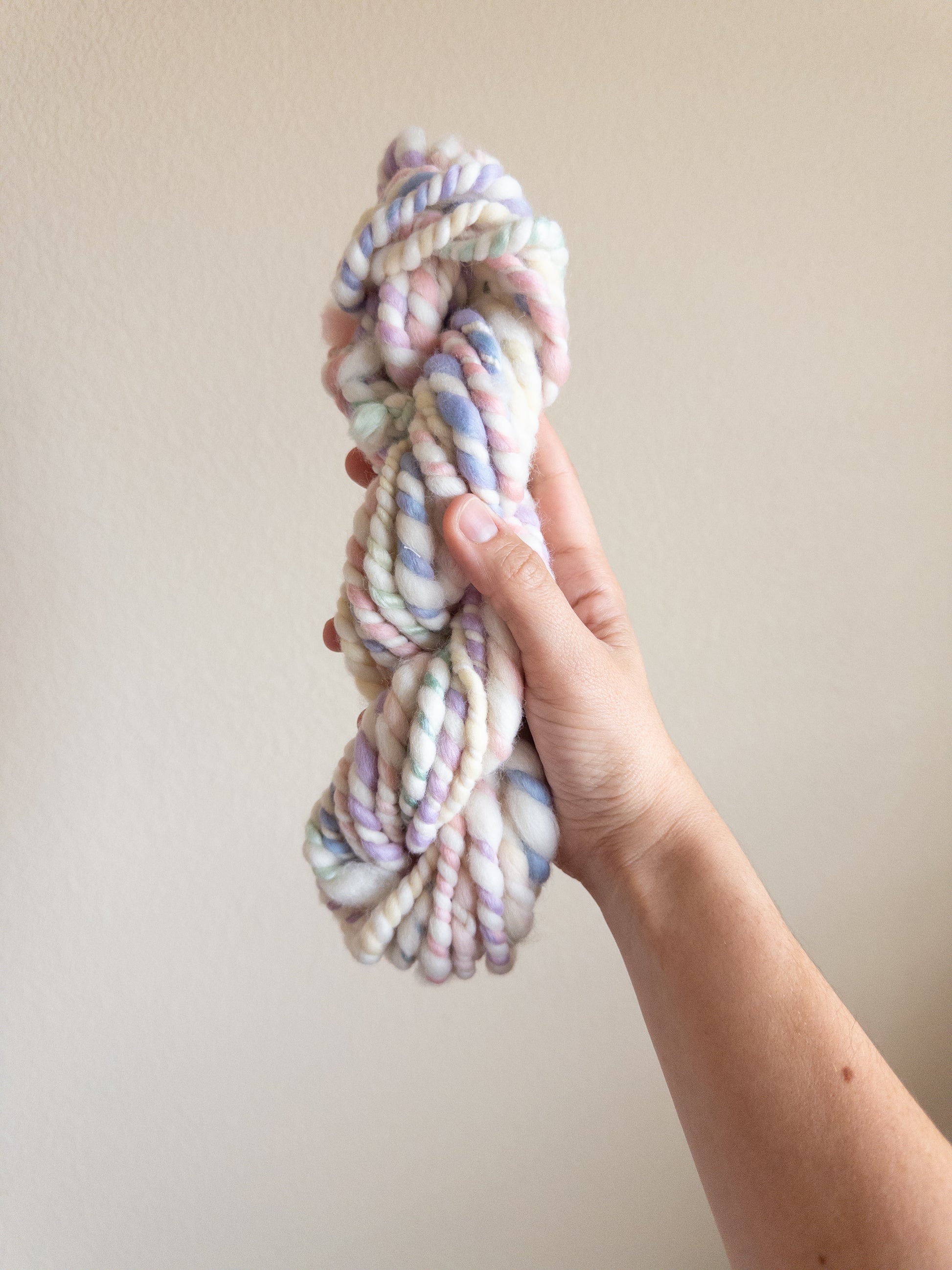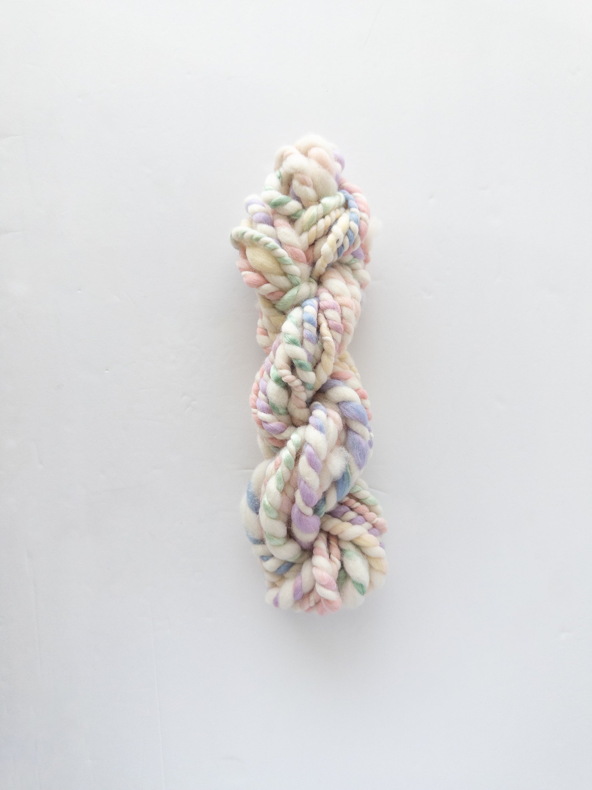 2 ply ivory based yarn with pastel variegated throughout.