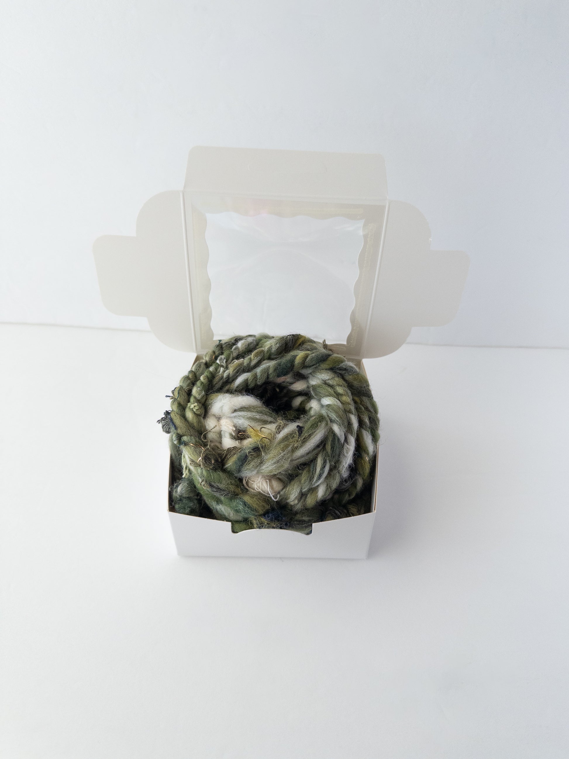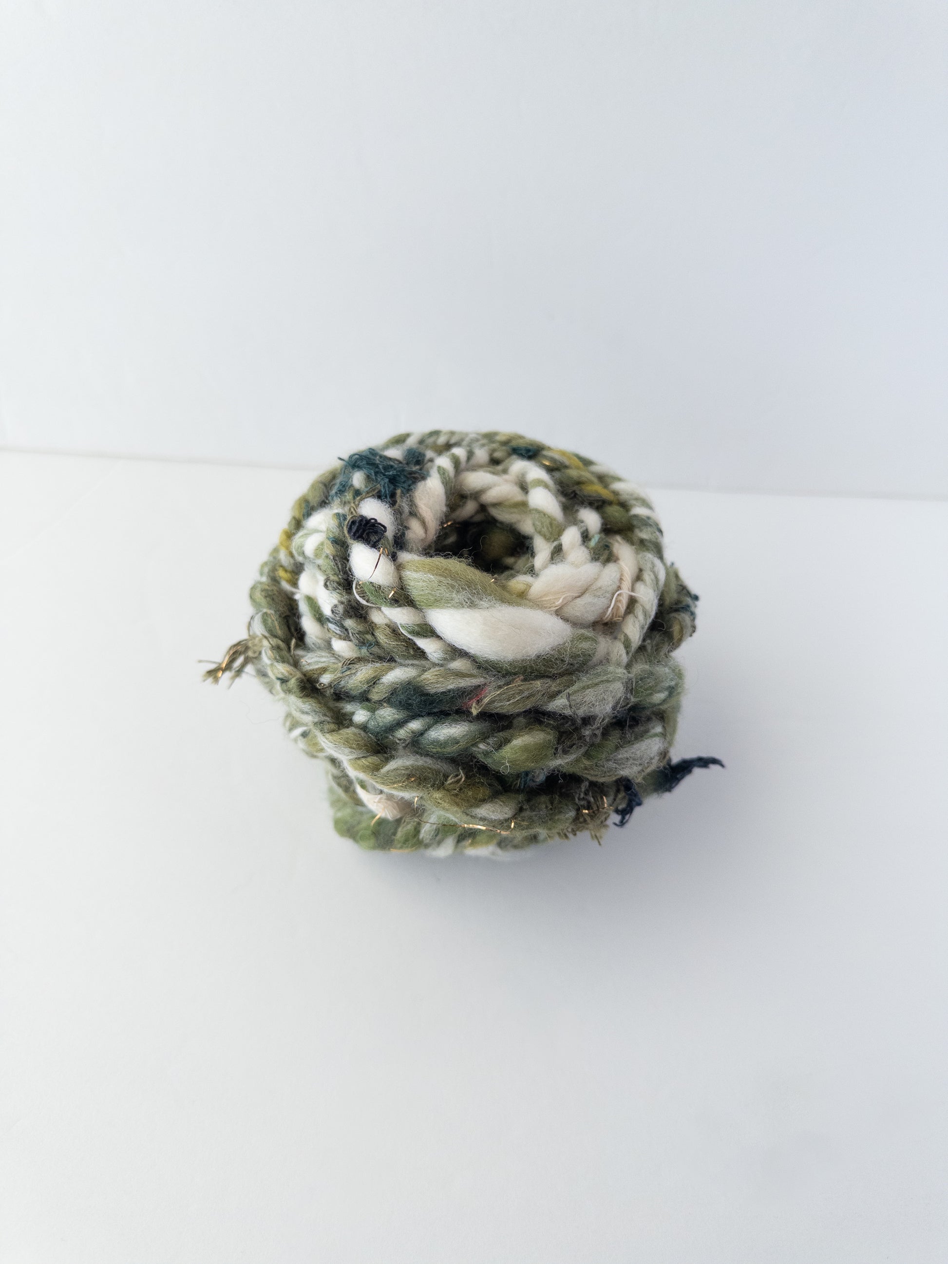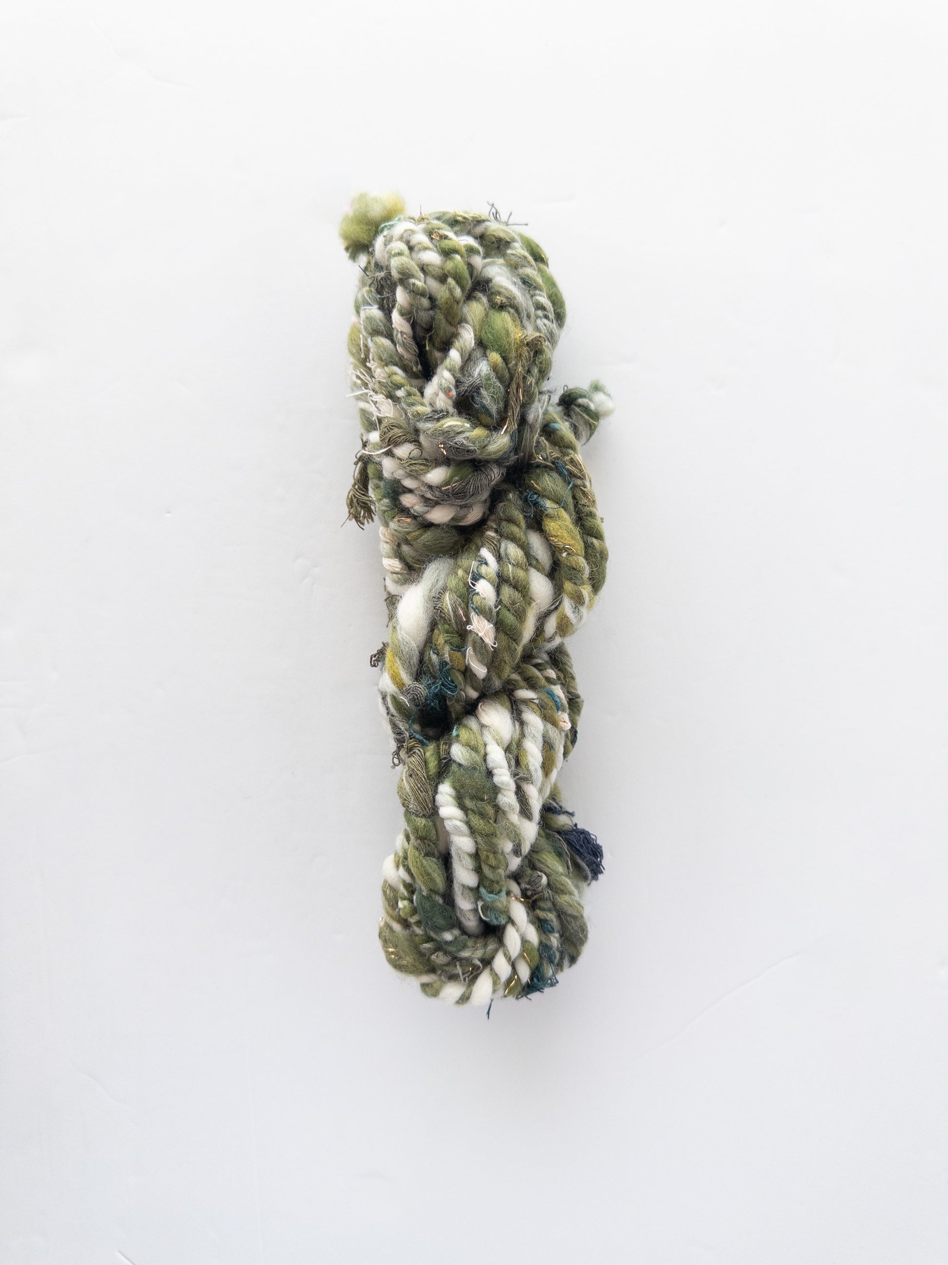 2 ply olive green, shades of green, and ivory based yarn with green scraps throughout.