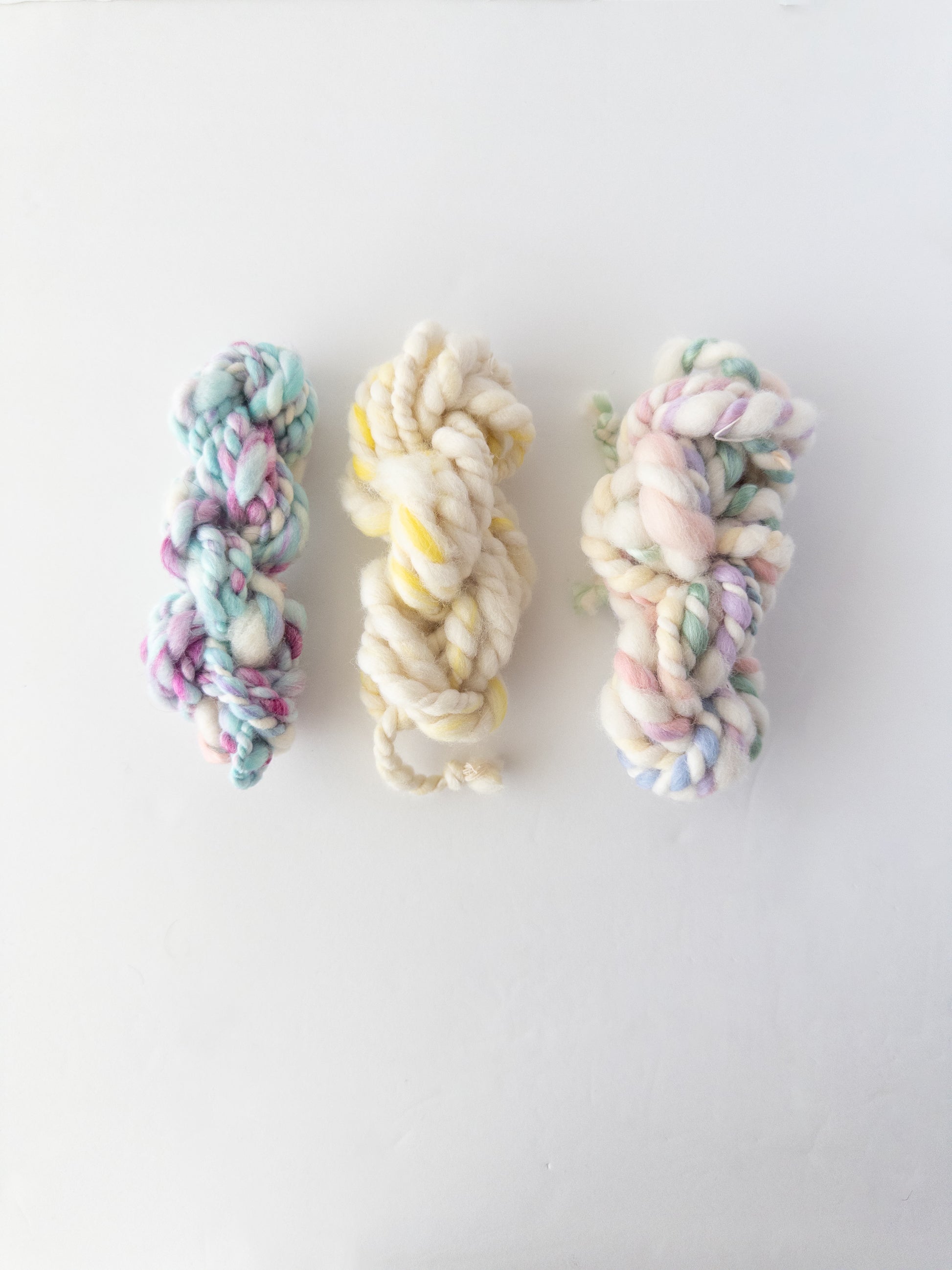 Sample scraps from 3 different yearns: cotton candy, macaron, and lemon crinkle.