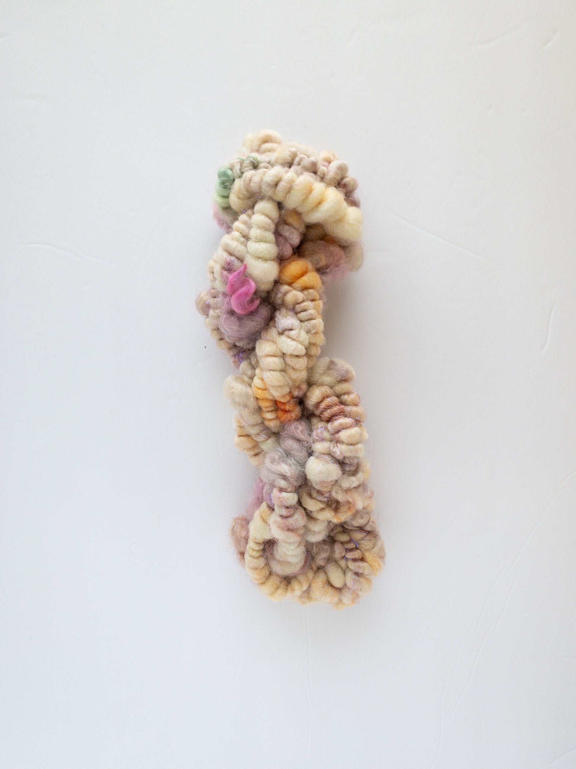This is an art yarn that I spun myself, the twist may be too tight or too loose in some areas as well as thick and thin. Pretty much, it is not perfect but will create a gorgeous organic look in your weavings.