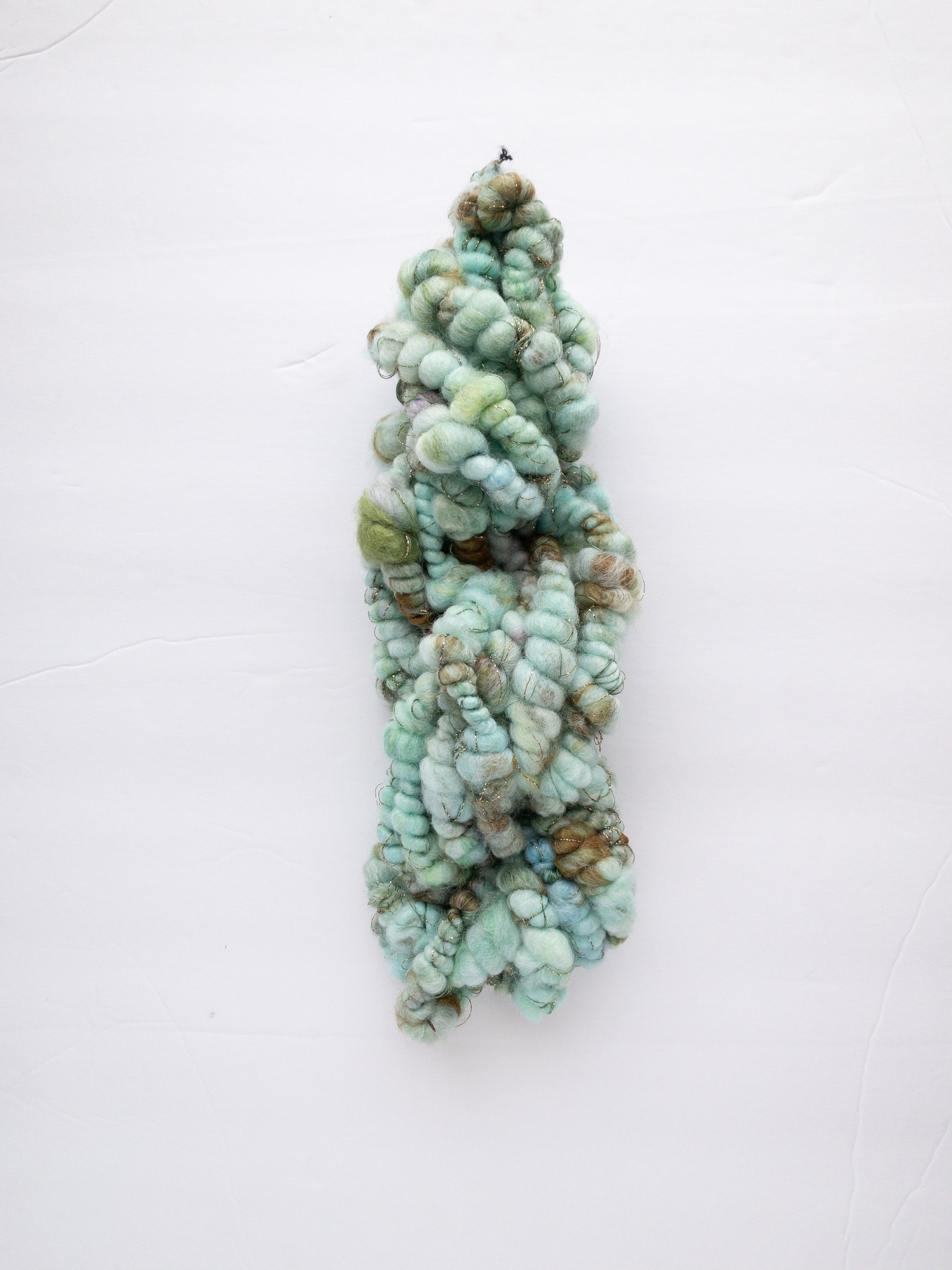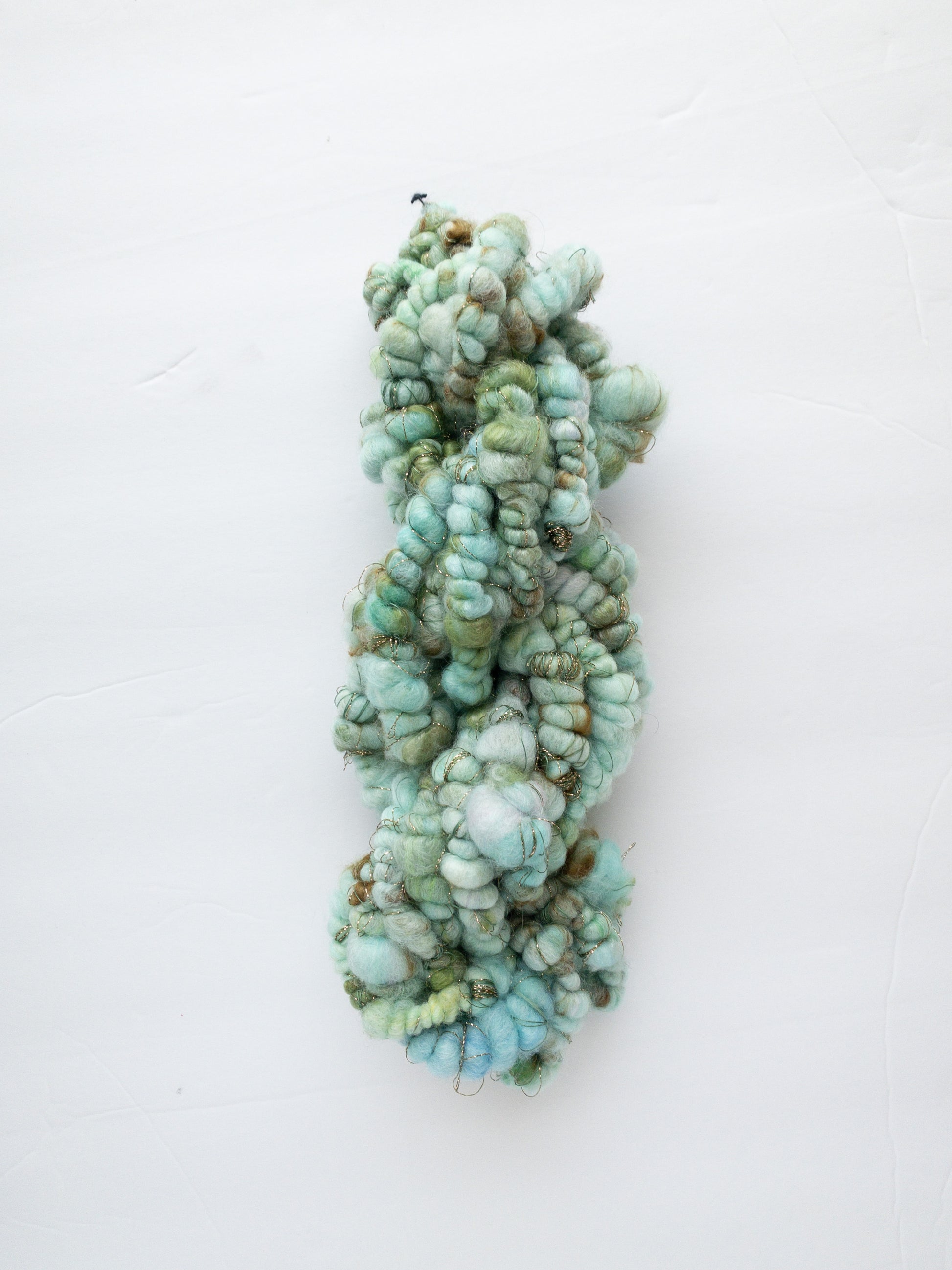 Coil plied handspun art yarn with blue, green, and brown fiber wrapped in gold green sparkle string.