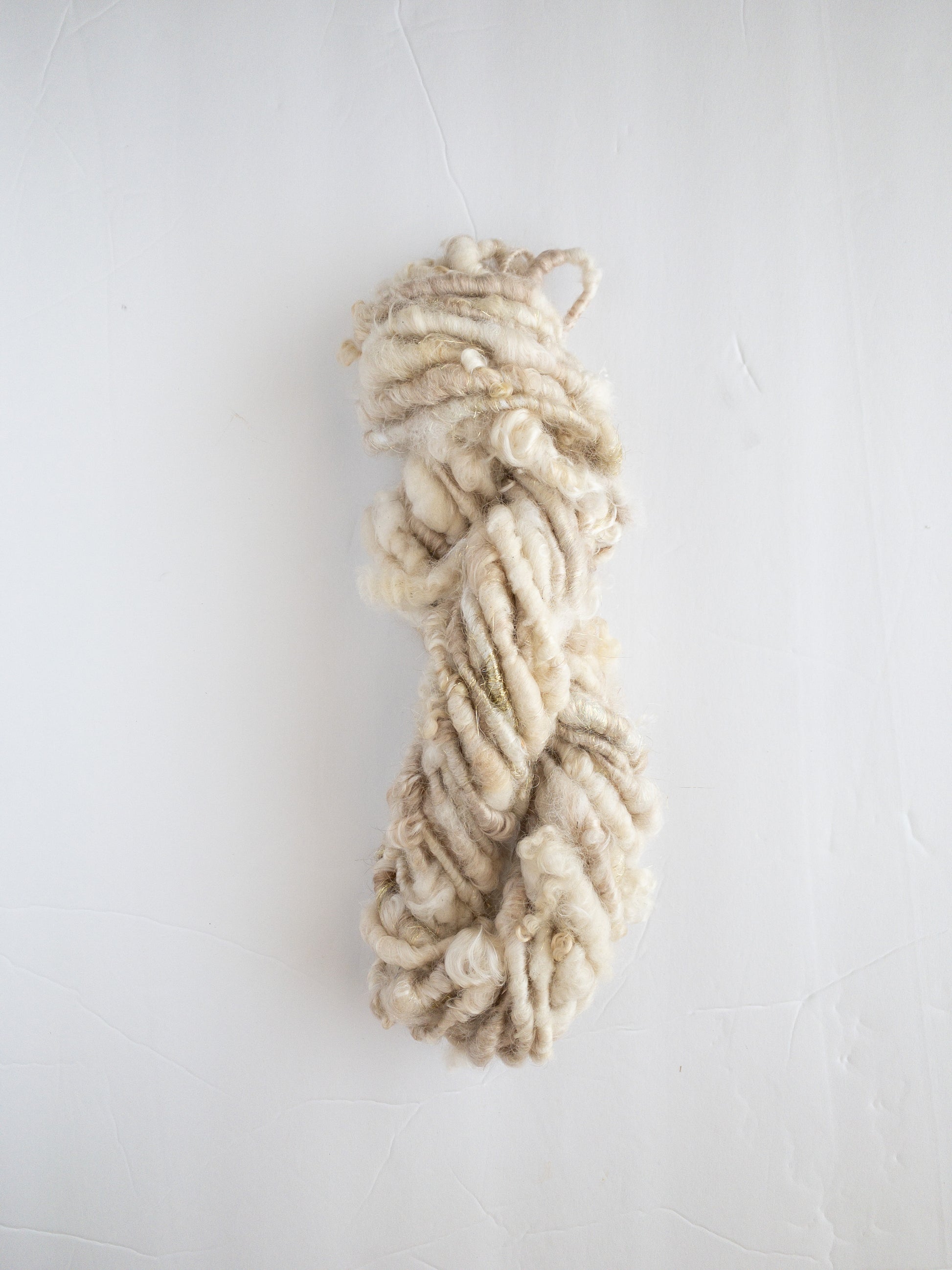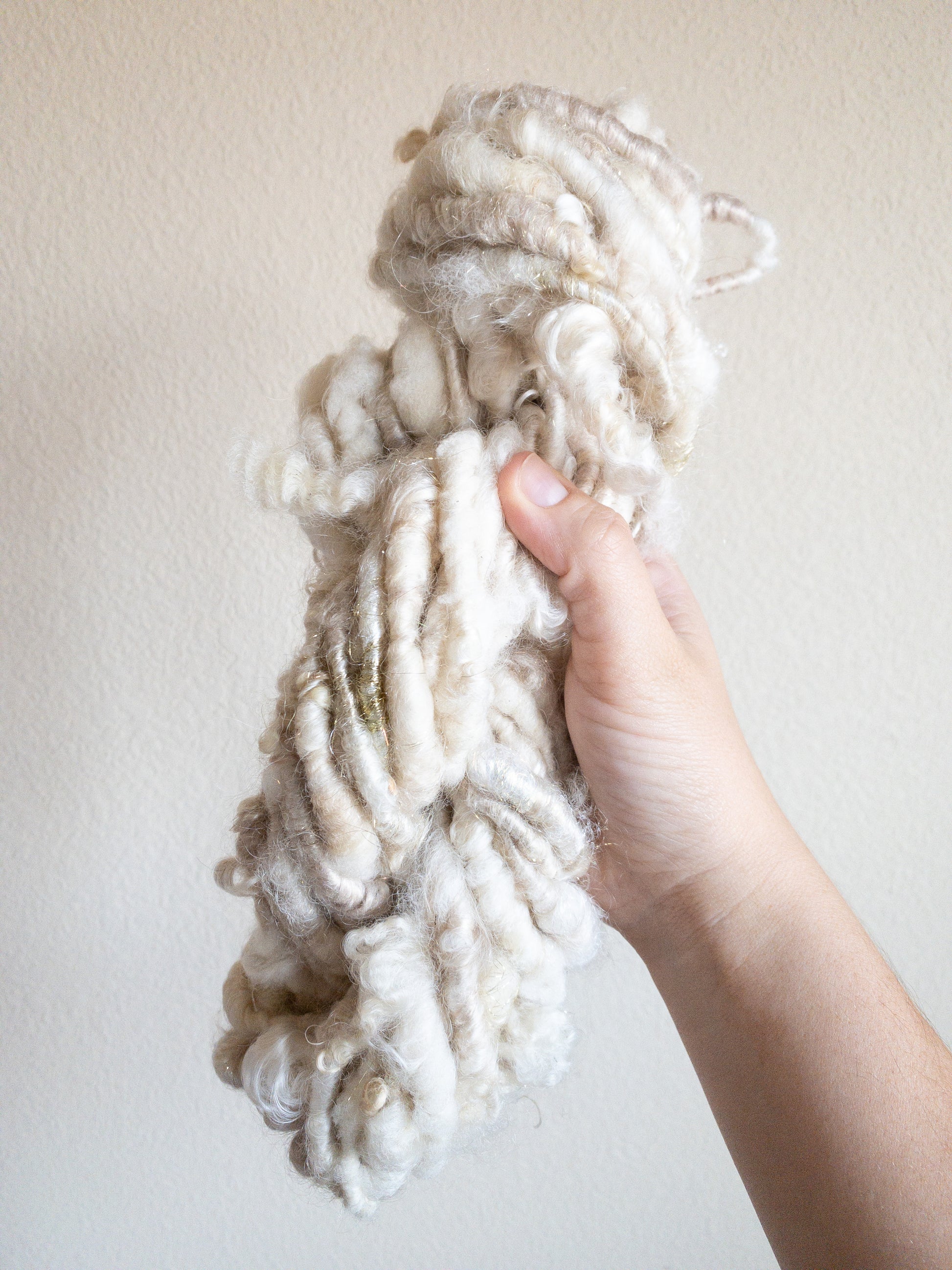 This is an art yarn that I spun myself, the twist may be too tight or too loose in some areas as well as thick and thin. Pretty much, it is not perfect but will create a gorgeous organic look in your weavings.